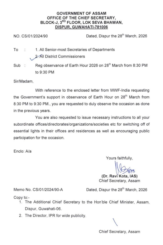 আজি, অৰ্থাৎ ২৮ মাৰ্চ, ২০২৬ তাৰিখে ৰাতি ৮.৩০ বজাৰ পৰা ৯.৩০ বজালৈ Earth Hour পালন কৰা হ’ব। এই সময়ছোৱাত সকলো চৰকাৰী কাৰ্যালয়, সংস্থা আৰু আৱাসগৃহত অপ্রয়োজনীয় পোহৰ বন্ধ কৰি শক্তি সংৰক্ষণৰ বাবে সহযোগিতা আগবঢ়াবলৈ অনুৰোধ জনোৱা হৈছে।
