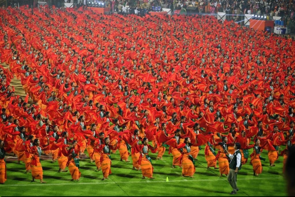 প্ৰধানমন্ত্ৰী নৰেন্দ্ৰ মোডীৰ উপস্থিতিত সৰুসজাই ষ্টেডিয়ামত ১০ হাজাৰৰো অধিক লোকে একেলগে বাগুৰুম্বা নৃত্য প্ৰদৰ্শন কৰে।